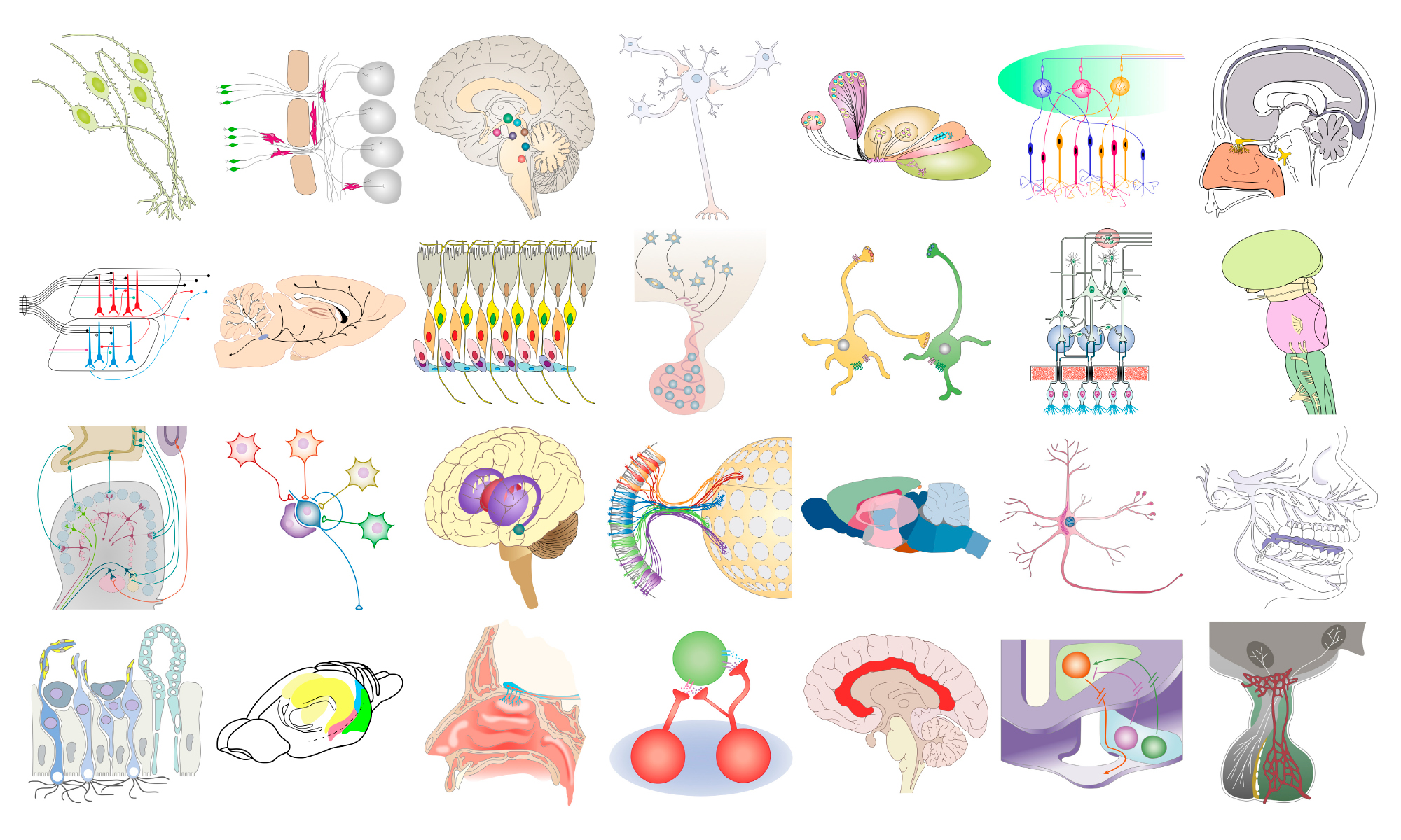 Since July 2017, Gill has been collecting examples of the visual elements that would be required for the conceptual figures in Yannis and Nisha’s journal articles. Gill has re-drawn the elements in Adobe Illustrator, to remove them from the context provided by their original conceptual figures, and has excluded any text and most of the annotation. The resulting images have been posted on the neurographical Instagram feed, with over 150 examples now added. Some of these images are shown in the header image.