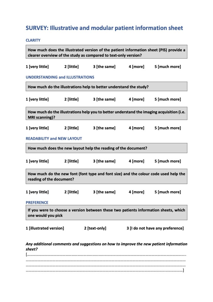 The relevant pages from the original PIS Word document were also submitted to the FAST-R team, to allow direct comparison with the new examples modules, together with a short questionnaire (shown to the left). This was designed to prompt debate about the effectiveness of the new layout and the inclusion of the illustrations.