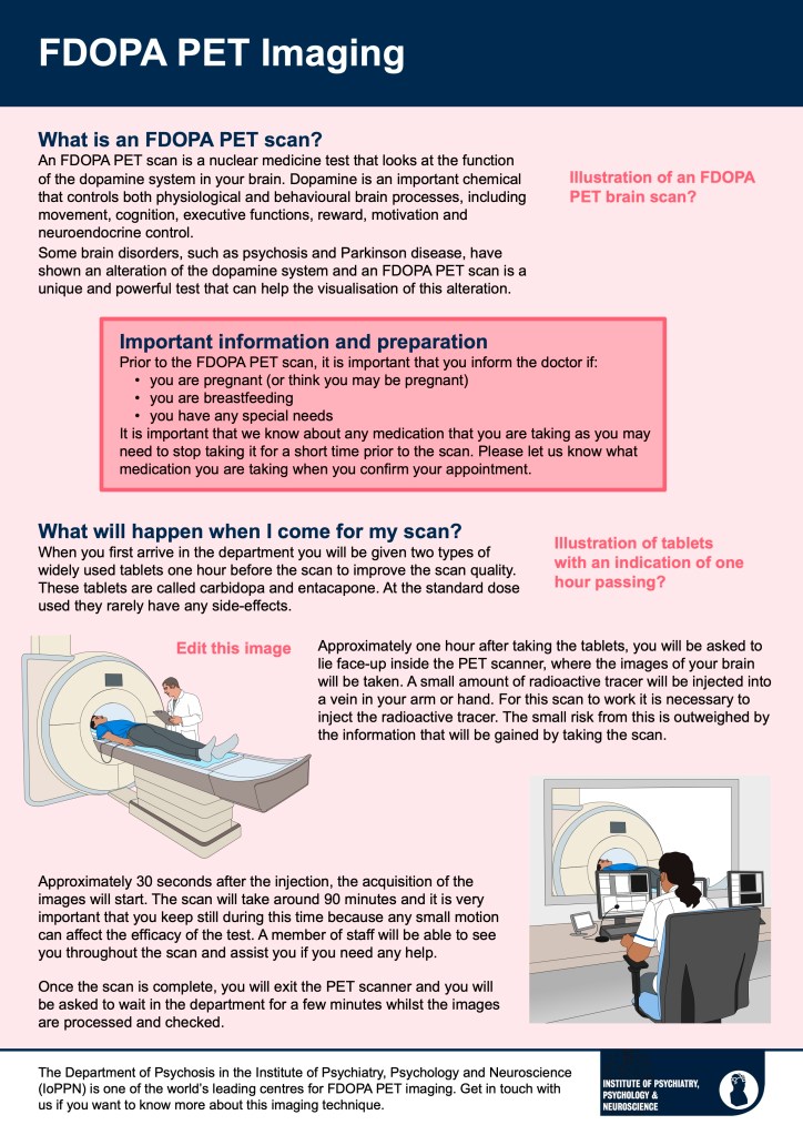 Gill created an initial version of the ‘dynamic’ leaflet, primarily to ensure that all of the text could be included on one A4 sheet and still leave room for images. She included two of the illustrations that had been used in the PIS, one showing the patient in the scanner with a physician and the other showing a radiographer observing the patient undergoing the scan. There seemed to be room for two more possible illustrations – one showing an FDOPA PET scan and one showing that a patient has to take two kinds of medication an hour before the scan. Gill took the dark blue colour from the IoPPN logo and used a pink colour from the King’s College London approved colour palette to use in the background.
