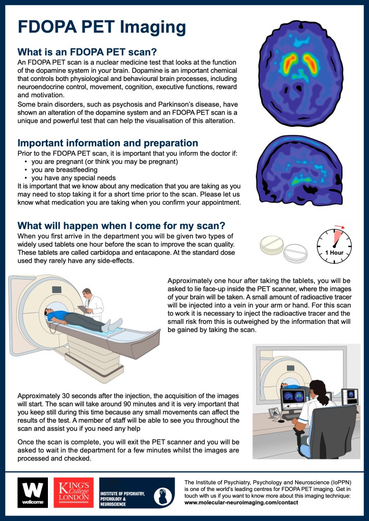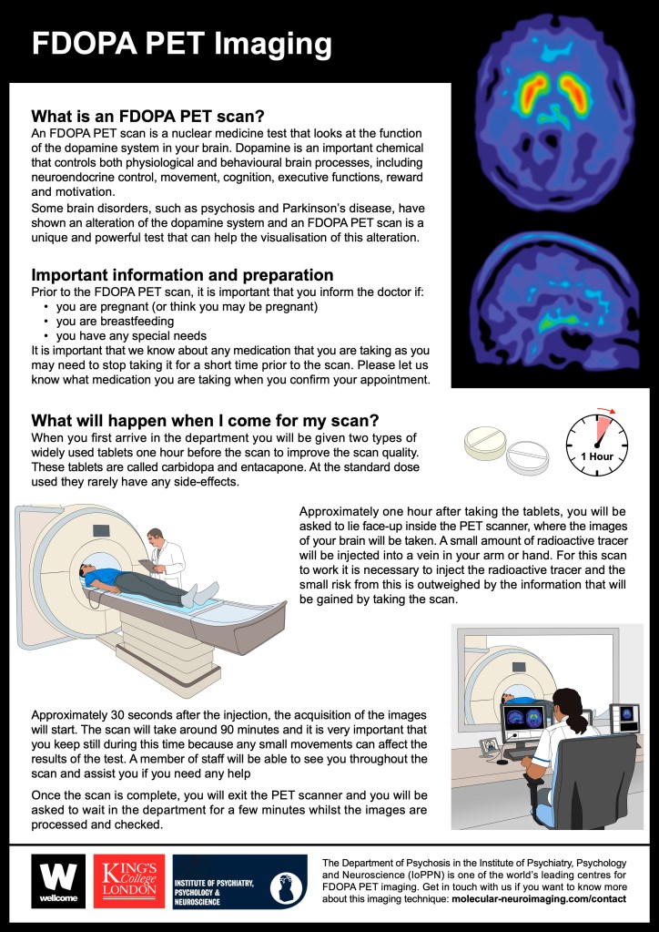 Before the meeting, Gill had produced a revised version of the FDOPA PET Imaging, changing the illustrations of the PET scans so that they had a rainbow colour scheme instead of the blue-green colour scheme used in the second version of the leaflet.