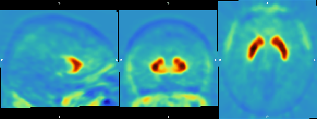 Giovanna liked the revised leaflet but had one more request – could the PET scan of the sagittal brain view (the lower PET scan illustration) show a red signal in the area of the striatum. Giovanna sent an example image (below) to show how this might look.
