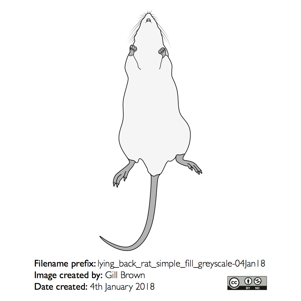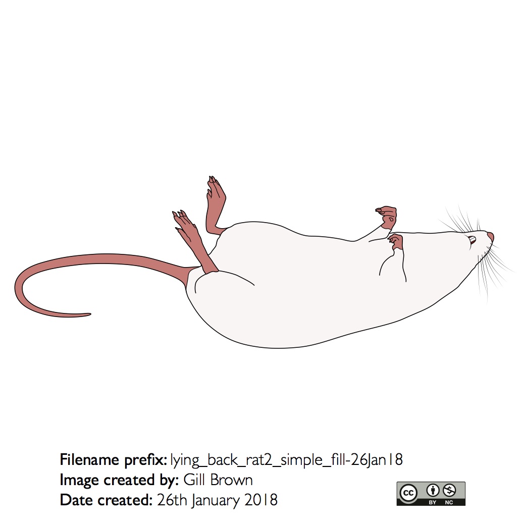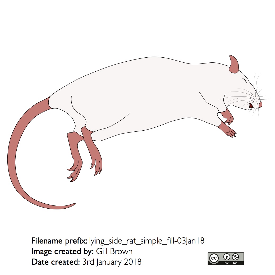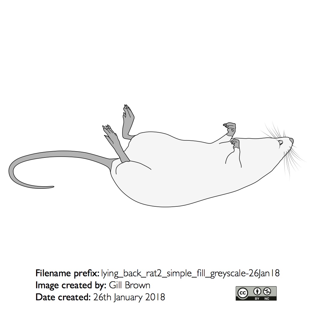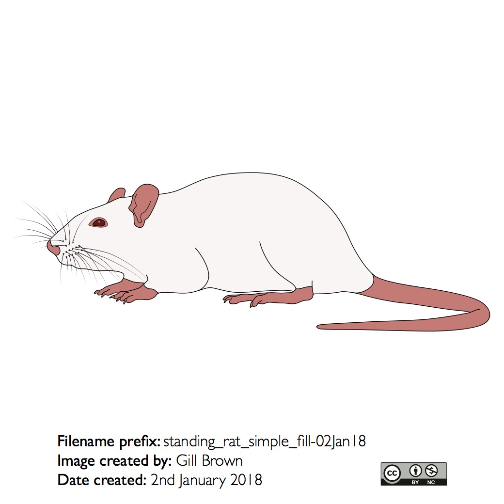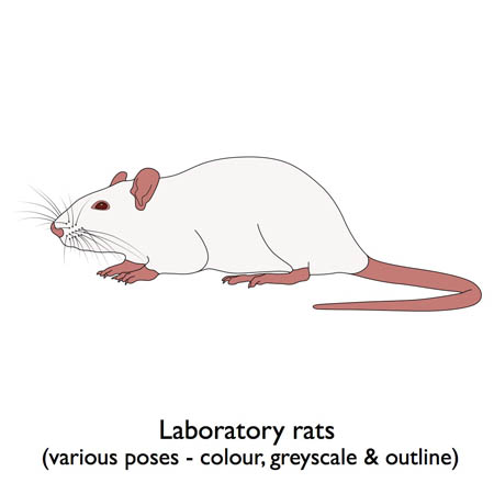 A selection of images of albino laboratory rats (in colour, greyscale and outline) in a variety of poses.